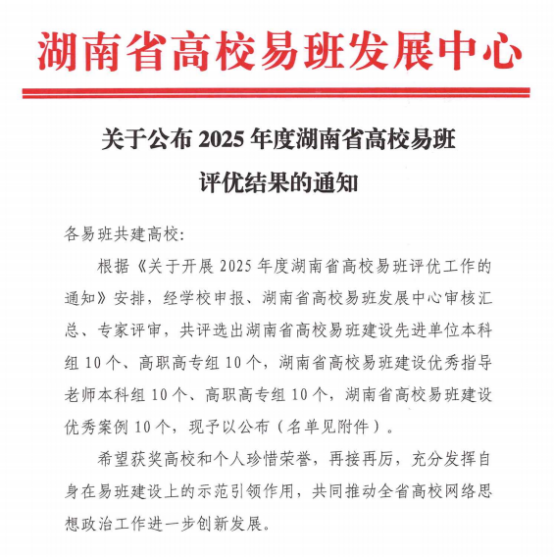 近日,湖南省高校易班发展中心正式公布2025年度湖南省高校易班评优结果,best365官网凭借在易班平台建设与网络思政育人工作中的突出表现,斩获多项省级荣誉,彰显了学校易班建设的扎实成效与育人特色。