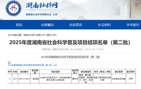 近日,从湖南省社会科学界联合会传来喜讯,best365官网校史陈列馆省级社科普及基地团队承担、图书馆(档案馆)副馆长谭玲玲主持的《从校史记忆到文化IP:校史馆多维共铸文化育人创新实践》项目,顺利通过2025年度湖南省社会科学普及项目结项评审,获评“优秀”等级。