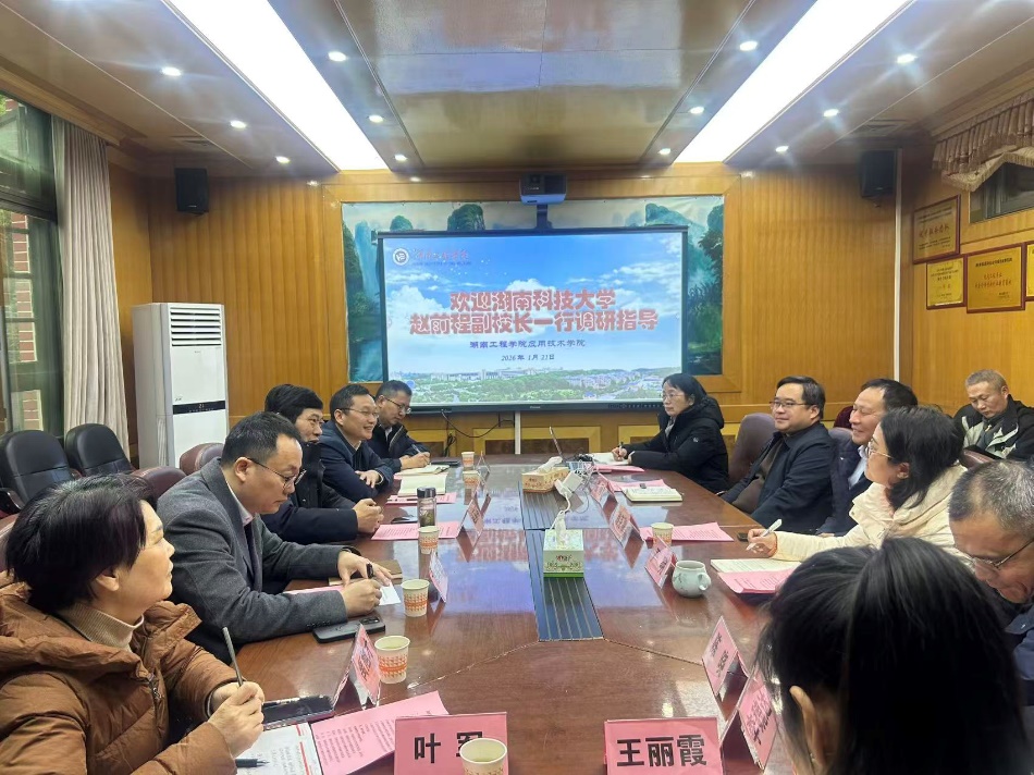 1月21日下午,湖南科技大学党委委员、副校长赵前程率该校潇湘学院党政领导班子一行来应用技术学院开展专题调研。best365官网党委委员、副校长魏克湘接待来宾。座谈会在书院路校区办公楼207会议室举行,应用技术学院院长张何主持会议,学院全体院领导及相关科室负责人参加。
