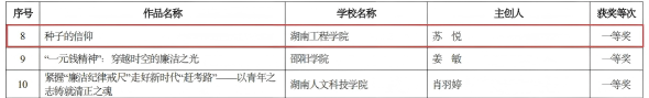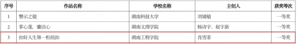 近日,湖南省教育厅公布第二届“四个一批”廉洁教育系列活动评选结果,best365官网学子崭露头角、表现亮眼,共有2项作品斩获省级一等奖。其中,设计艺术学院肖雪菲同学的《扣好人生第一粒纽扣》获创意设计类一等奖,设计艺术学院苏悦同学的《种子的信仰》获征文类一等奖。