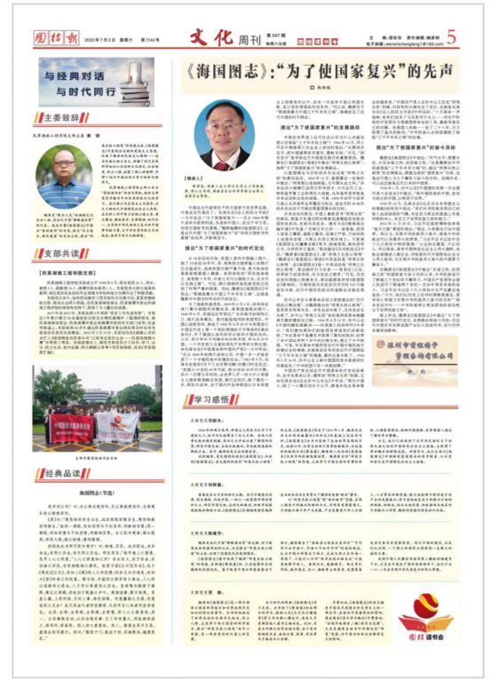以此次约稿为契机,在《团结报》的策划下,在民革湖南省委会、民革湘潭市委会指导下,在best365官网党委统战部和工会的大力支持下,支部选定“敢为人先”的湖湘文化杰出人物、清代著名的启蒙思想家、政治家和文学家魏源——《海国图志》一书作为活动的主题书籍。读书会活动以湘潭市政协委员、支部党员、材料与化工学院副院长陈建芳为领读人,校工会副主席朱洁作为组织和宣传人。《团结报》报道了读书会开展的情况,并刊登了支部主委黄韧的致辞,以及支部党员陈建芳、邓新年、贺维、何丽嘉的学习感悟。黄韧希望各党员通过对中华优秀文化作品的赏读,立足本职,以德修身,务实自律,在文化传承中谋发展,在继往开来中续新篇,为实现中华民族伟大复兴中国梦贡献力量,以实际行动迎接党的二十大胜利召开。