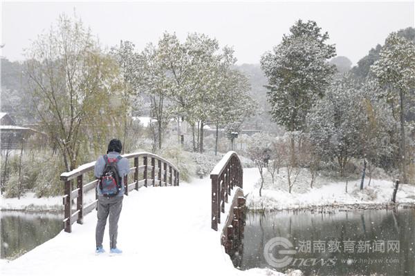 洁白晶莹的雪花满天卷地,图书馆、主教学楼粉妆玉砌、安静如画。身姿坚挺的松树被披上了一层晶莹的披肩,矮矮胖胖的小雪人好奇地盯着知行广场上来来往往的行人。