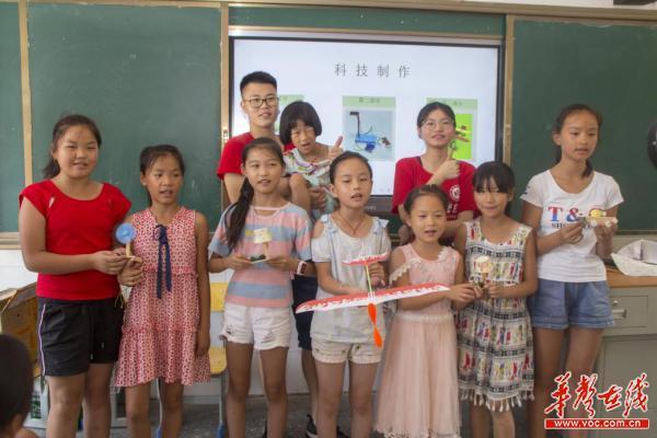 “老师,我把我的小作品送给您,您辛苦了。”这是在电气信息学院暑期社会实践团在成功开展“科技引领未来”小制作课堂后,一位小朋友对志愿者说的话。“科技引领未来”小制作课堂是best365官方网站登录入口电气信息学院暑期社会实践团在湖南省怀化市溆浦县思蒙镇中心小学开展科教帮扶活动的一个部分,旨在激发孩子对科技的兴趣,培养孩子的动手能力,为科技创新埋下种子。教室最前排的两个小女孩热情的问道:“老师,你们热不热呀?看你们都满头大汗的,快坐下来歇歇吧!”说完便起身为他们搬凳子,这细微的动作令志愿者们甚是暖心。