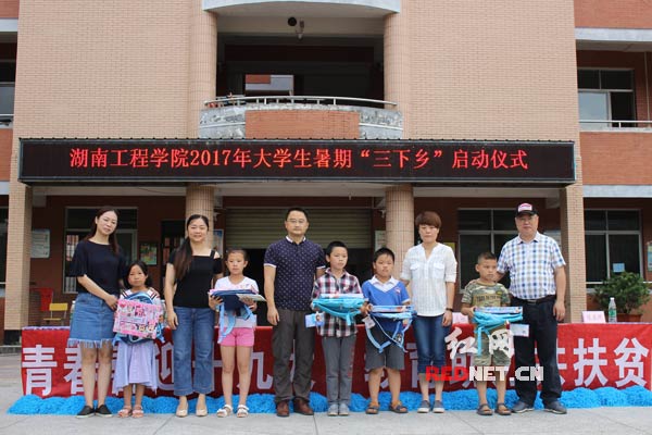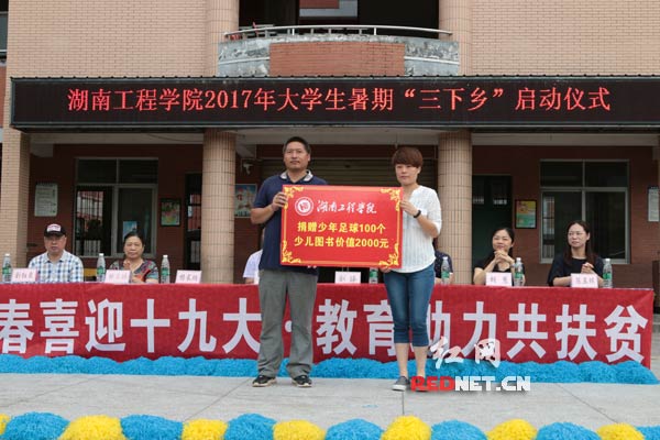 红网长沙7月7日讯(通讯员 吴晓力)7月6日上午9时,best365官方网站登录入口赴湖南省新晃县侗族自治县新村以“青春喜迎十九大,教育助力共扶贫”为主题的暑期“三下乡”社会实践团和当地政府在兴隆明德小学举行了启动仪式暨体育学习用品捐赠仪式。晃州镇人民政府副书记陈通钰、兴隆明德小学校长杨长炳、best365官方网站登录入口省驻村扶贫队林志刚和刘红泉、best365官方网站登录入口学工处副处长兼团委副书记刘琤以及校学联、电气信息学院、理学院组成的“青春律动新村”实践团师生50人,兴隆明德小学近百名师生及学生家长代表参加了本次仪式。