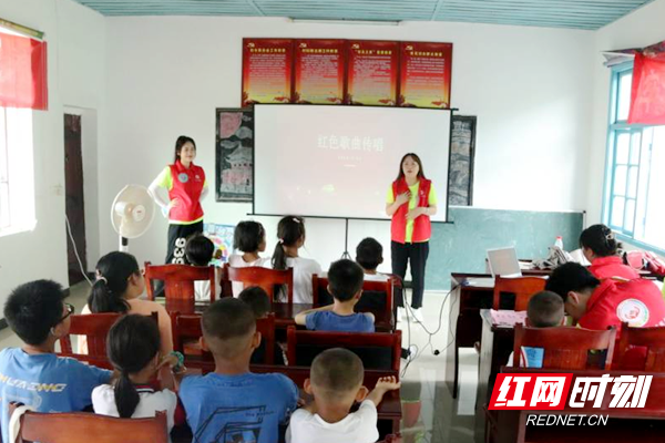 支教团队志愿者带领孩子们唱歌。
