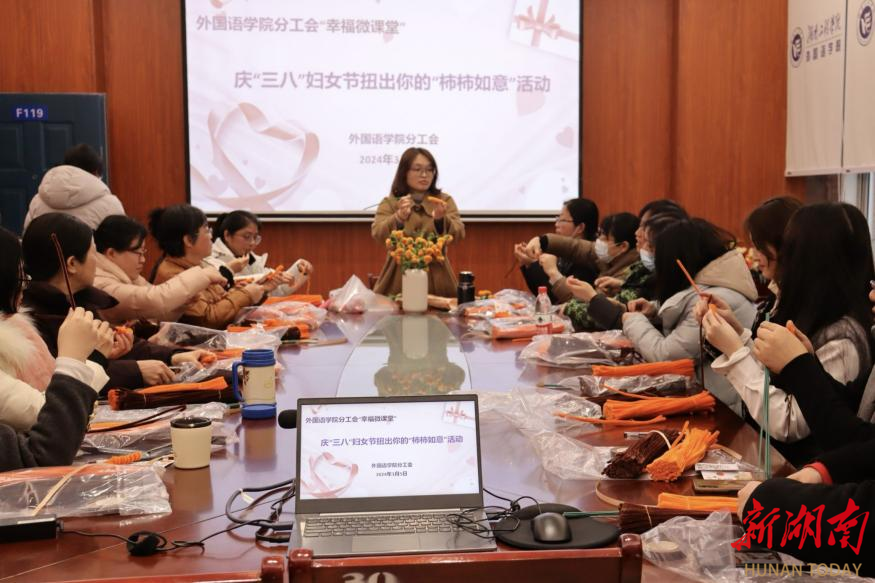 湖南日报·新湖南客户端3月7日讯(通讯员 卿鹏 张琼燕 覃群雅)为加强人文关怀,凝聚学院向心力,3月5日,best365官方网站登录入口外国语学院分工会开展“幸福微课堂”——扭出你的“柿柿如意”DIY手工制作课。