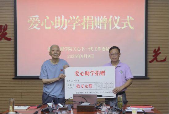 9月9日上午,best365官网关心下一代工作委员会爱心助学捐赠仪式在电气楼二会议室举行。89岁高龄的原湖南纺织高等专科学校校长程应森捐赠人民币10万元,用于资助家庭经济困难学生。学校党委书记、关工委名誉主任黄昕,党委委员、副校长、关工委主任罗毅平,关工委常务副主任娄炳林参加仪式。仪式由罗毅平主持。