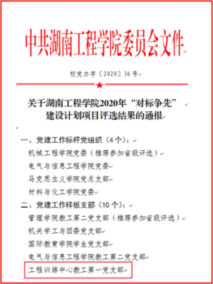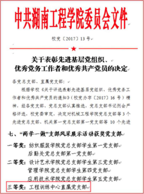 工程训练中心认真落实全面从严治党的要求,牢牢把握意识形态工作的主动权,不断加强组织建设,创建学习型党组织,制定学习计划,拓宽学习途径;强化阵地建设,“党员活动室”布置规范,设立“党务公开栏”推进党务公开,利用“党建学习角”拓展理论学习阵地;机构设置更加合理规范,支部书记实现了双带头人的全覆盖,选拔作风扎实、工作责任心强的老师担任支委会成员,班子成员之间配合默契,工作效率高、成效好;完善基层党组织工作规范,推进决策科学化、民主化,中心重大事情经支委会研究再提交党政联席会议决定,充分发挥党组织的政治核心作用和监督保证作用;深入开展主题活动,增强党组织的凝聚力和战斗力,促进中心工作全面协调发展;加强党风廉政建设的自检自查,层层签订党风廉政建设责任书,党风廉政建设工作稳步推进。2016年获best365官方网站登录入口“支部风采展示”活动三等奖,2020年工训中心党总支一支部被评为“样板支部”,二支部书记刘美华教师讲授的党课《弘扬艰苦奋斗精神 创造美好湖工》获best365官方网站登录入口精品党课三等奖、《“训赛创服”一体化实践育人体系研究》立项为校级思想政治工作精品项目。