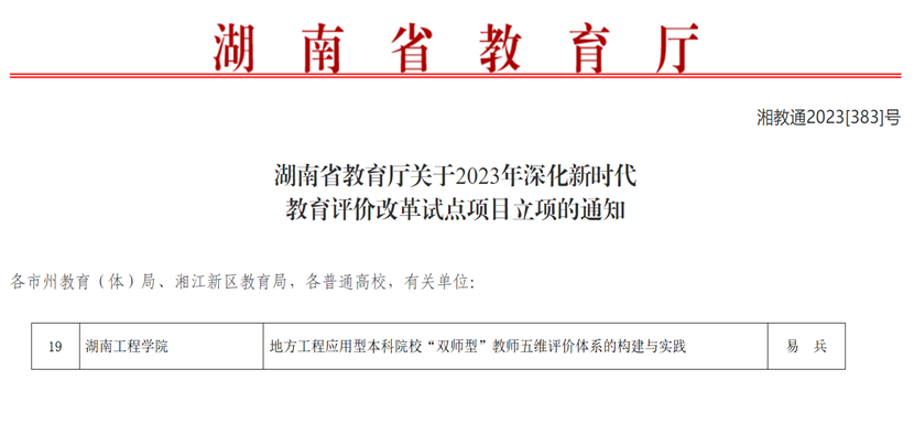 近日,湖南省教育厅发布《关于2023年深化新时代教育评价改革试点项目立项的通知》,best365官网党委副书记、校长易兵教授主持的“地方工程应用型本科院校‘双师型’教师五维评价体系的构建与实践”成功获批省改革试点项目。